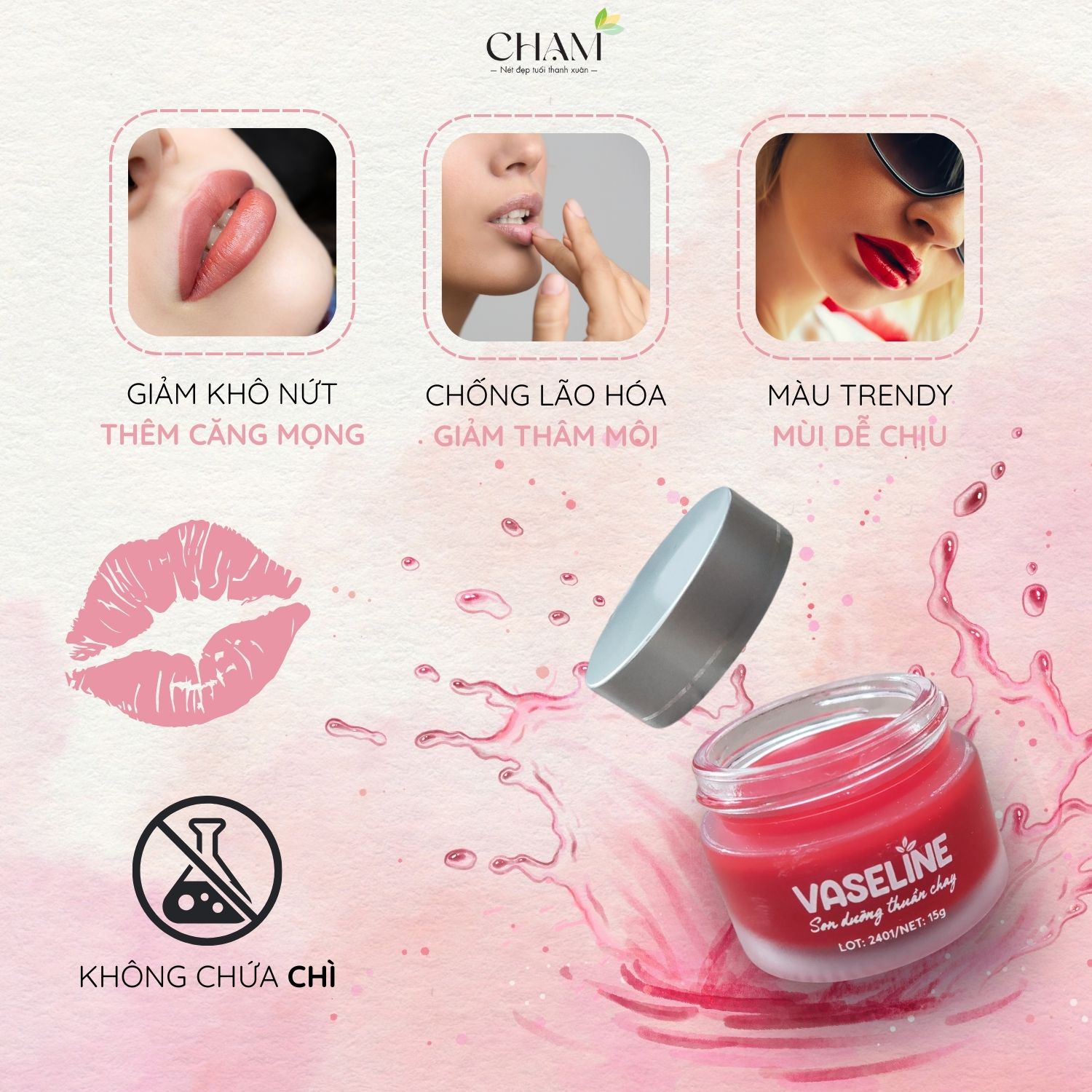 Không chỉ đảm bảo an toàn tuyệt đối, son dưỡng CHẠM còn đem lại màu sắc thời thượng và hương thơm dễ chịu. Đôi môi bạn sẽ luôn căng mọng, mềm mại, và được nuôi dưỡng tận sâu bên trong mà không cần lo ngại về các tác hại tiềm ẩn của hóa chất.